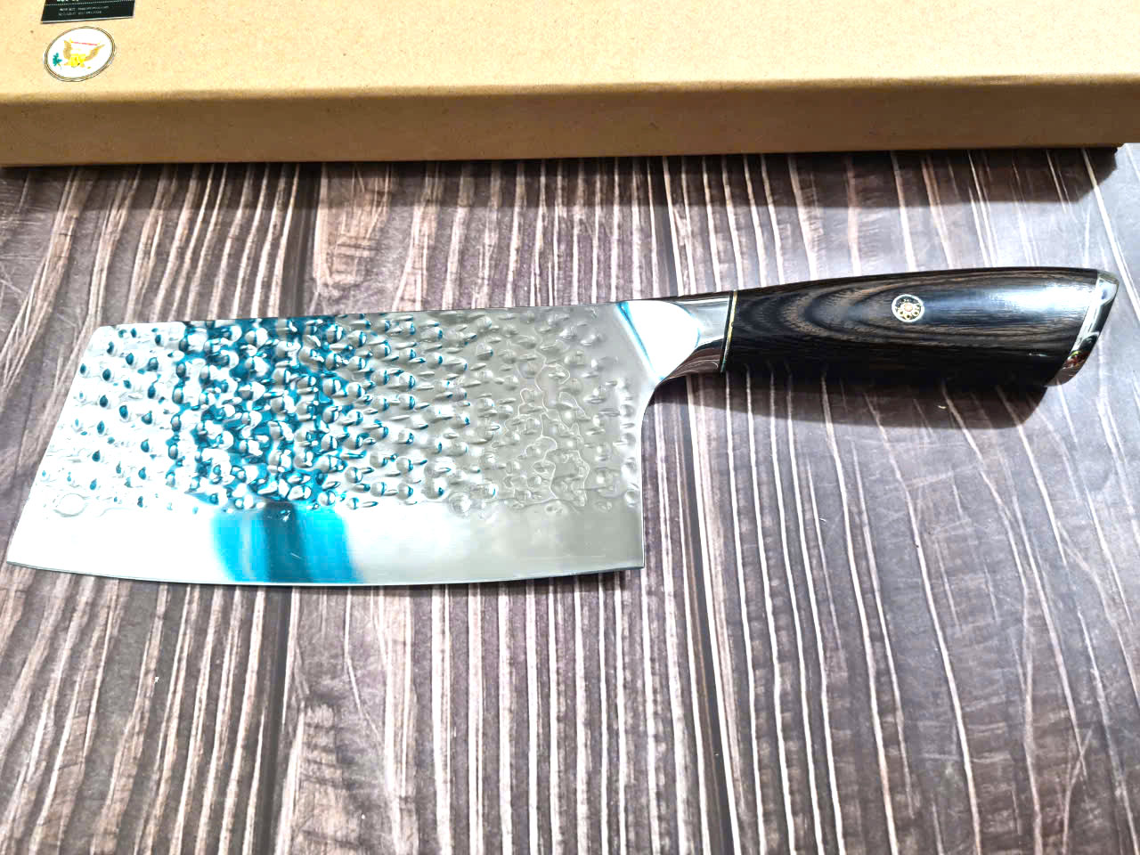 - Chức năng: thái thịt, rau củ quả - Kích thước: Lưỡi: 17cm, cán: 12cm, rộng: 5cm, dầy: 1ly, trọng lượng: 200g - Cán : Gỗ cẩm chỉ, Chốt, Khâu ĐỒNG ĐỎ , keo liên