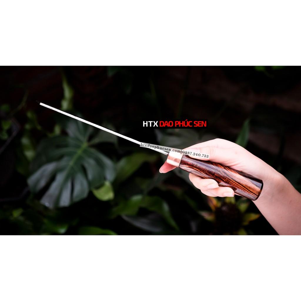 - Chức năng: chuyên chặt thái cá, chặt gà, lọ - Kích thước: Lưỡi: 26cm, cán: 12,5cm, rộng: 6,5cm, dầy: 4ly, trọng lượng: 480g - Cán : Gỗ mun , Khâu và chốt đồng đỏ