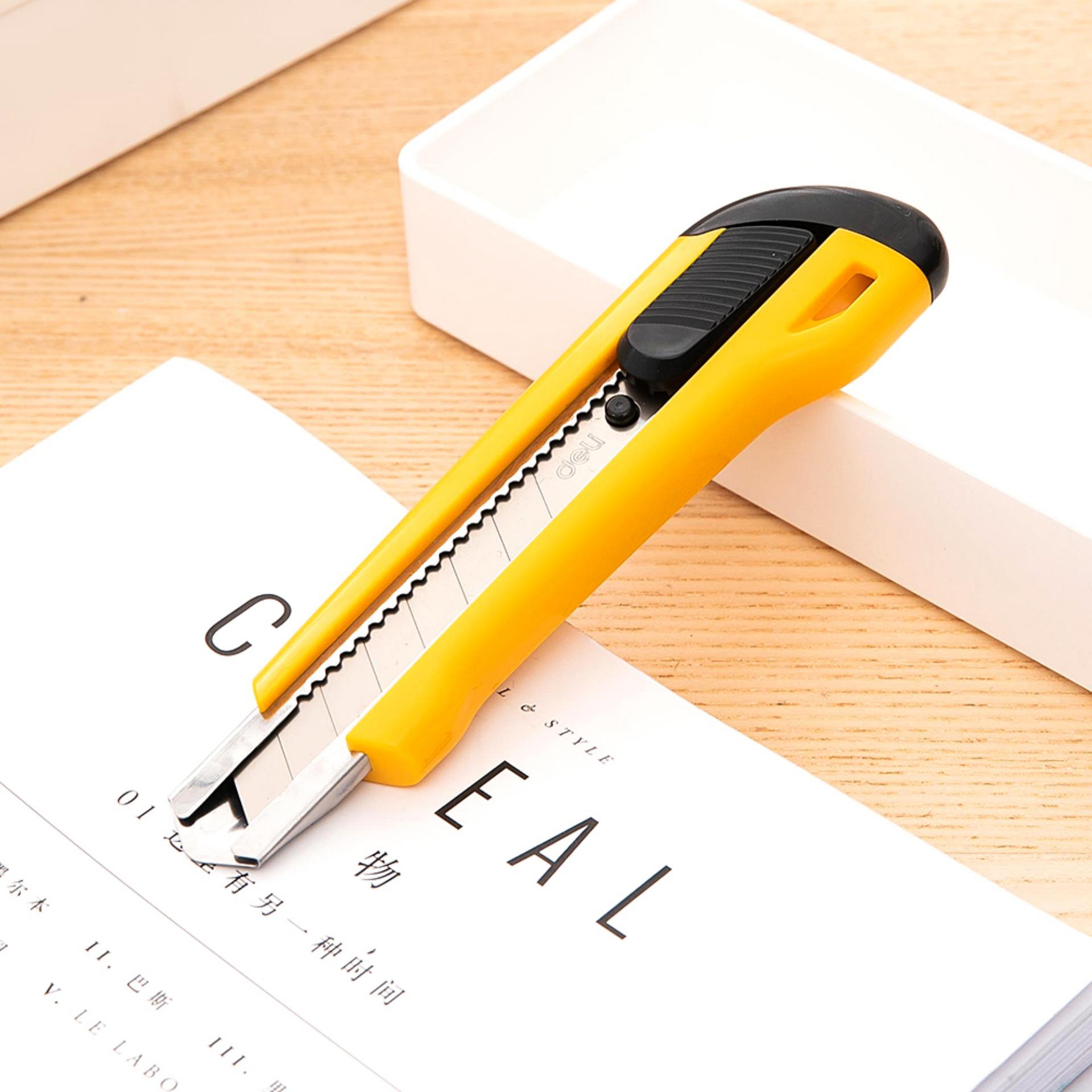 Dao Rọc Giấy Đại Deli - 2042 - Màu Vàng Trọng lượng 90gram, có kích thước 0.5 x 18 x 100 mm nhỏ gọn, tay cầm cong dễ cầm nắm. Lưỡi dao được rút gọn,
