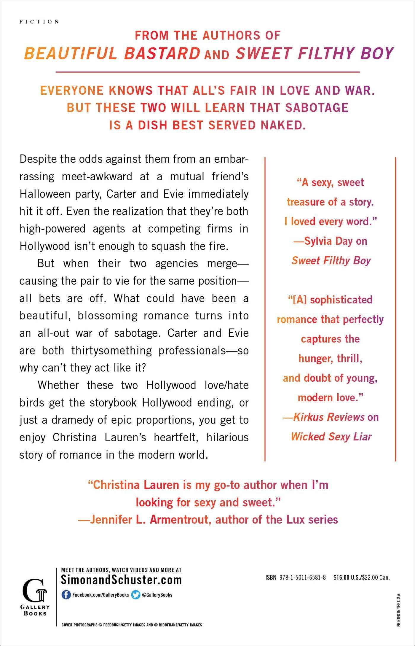 All's fair in love and war. The first standalone romance by New York Times and #1 international bestselling author Christina Lauren (Beautiful Bastard) is a sexy, compulsively readable romance that dives headlong into the thrill and doubt of modern love. Despite a meet-awkward at a mutual friend's party, Carter and Evie immediately hit it off. Even the realization that they're both high-powered agents at competing firms in Hollywood isn't enough to smother the flames. But when their two agencies merge-causing the pair to vie for the same position-all bets are off. What could have been a beautiful, blossoming romance turns into an all-out war of sabotage. Carter and Evie are both thirty-something professionals-so why can't they act like it? When push comes to shove and love fights with hate, will these two ever get their fairy tale Hollywood ending? 'A smart, sexy romance for readers who thrive on girl power.' Kirkus Reviews