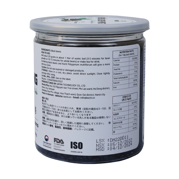 Khối lượng tịnh: 500g. THÀNH PHẦN: - Đậu đen rang xanh lòng hạt nhỏ. HƯỚNG DẪN SỬ DỤNG: - Cho khoảng 20g vào khoảng 1 lít nước, đun sôi (3 – 5 phút với dạng