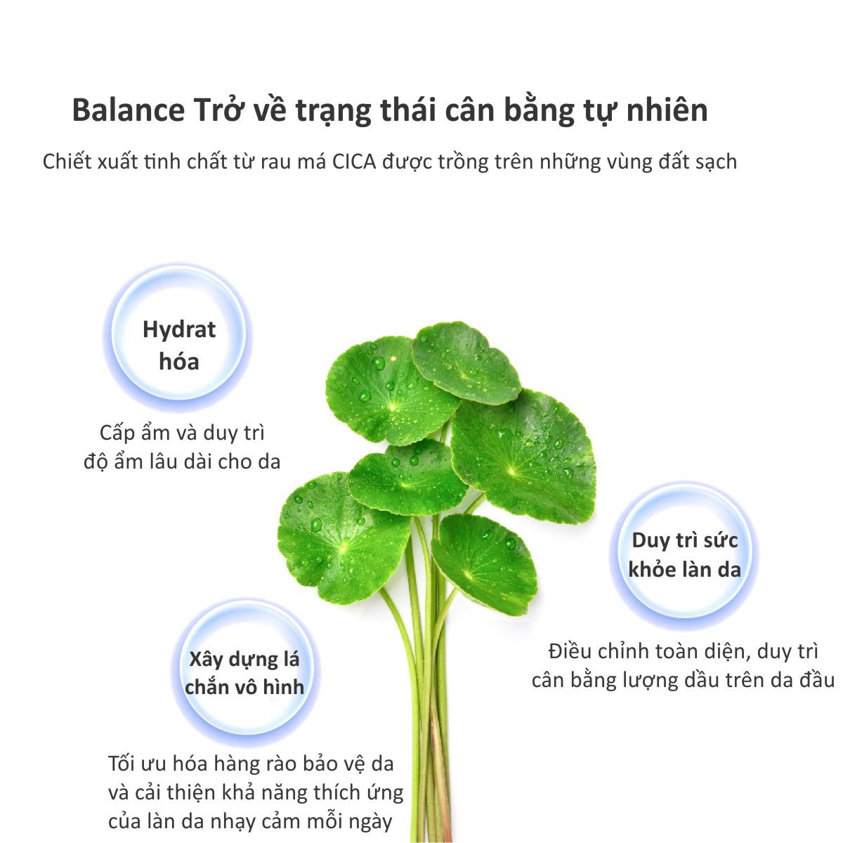 - Rau má: chiết xuất Centella Asiatica (rau má), một nguyên liệu thô được chứng nhận hữu cơ từ tổ chức Châu Âu ECOCERT (COSMOS) nổi tiếng thế giới, được kiểm duyệt nguồn gốc kỹ càng trước khi đến tay người tiêu dùng, không chứa bất kỳ chất độc hại nào.