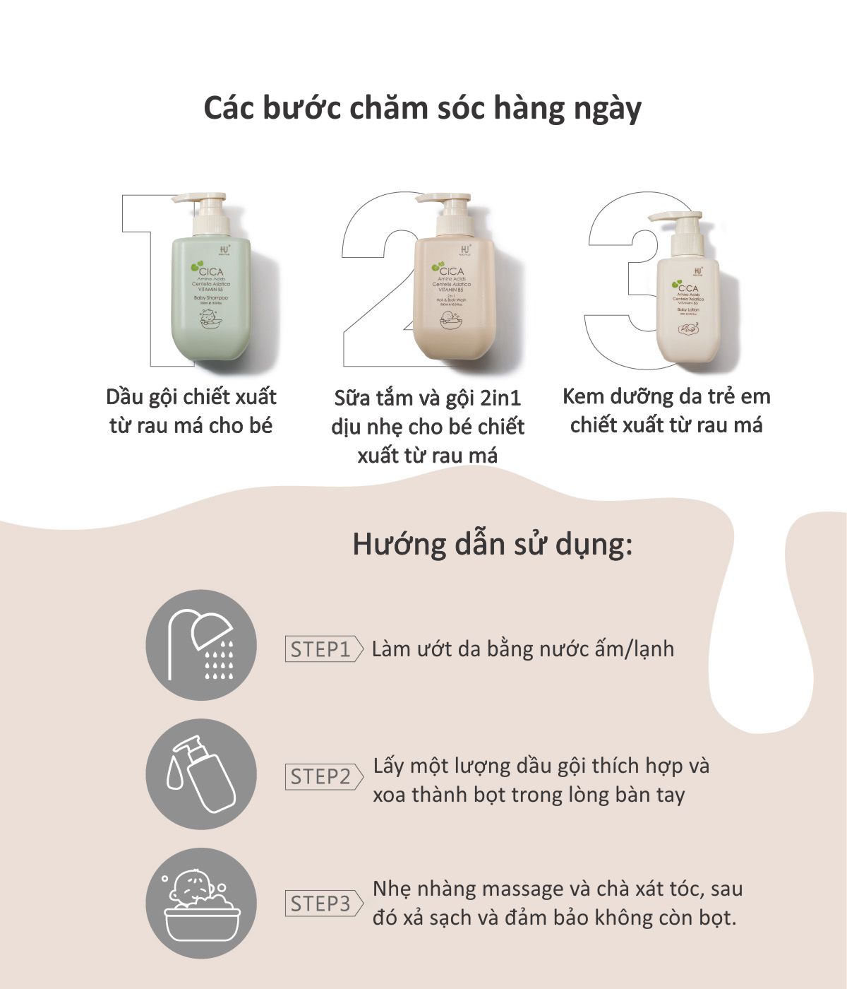 DẦU GỘI DỊU NHẸ CHO BÉ CHIẾT XUẤT TỪ RAU MÁ Công thức an toàn - Dưỡng ẩm và cấp nước - Phù hợp cho da nhạy cảm - Làm dịu và phục hồi •