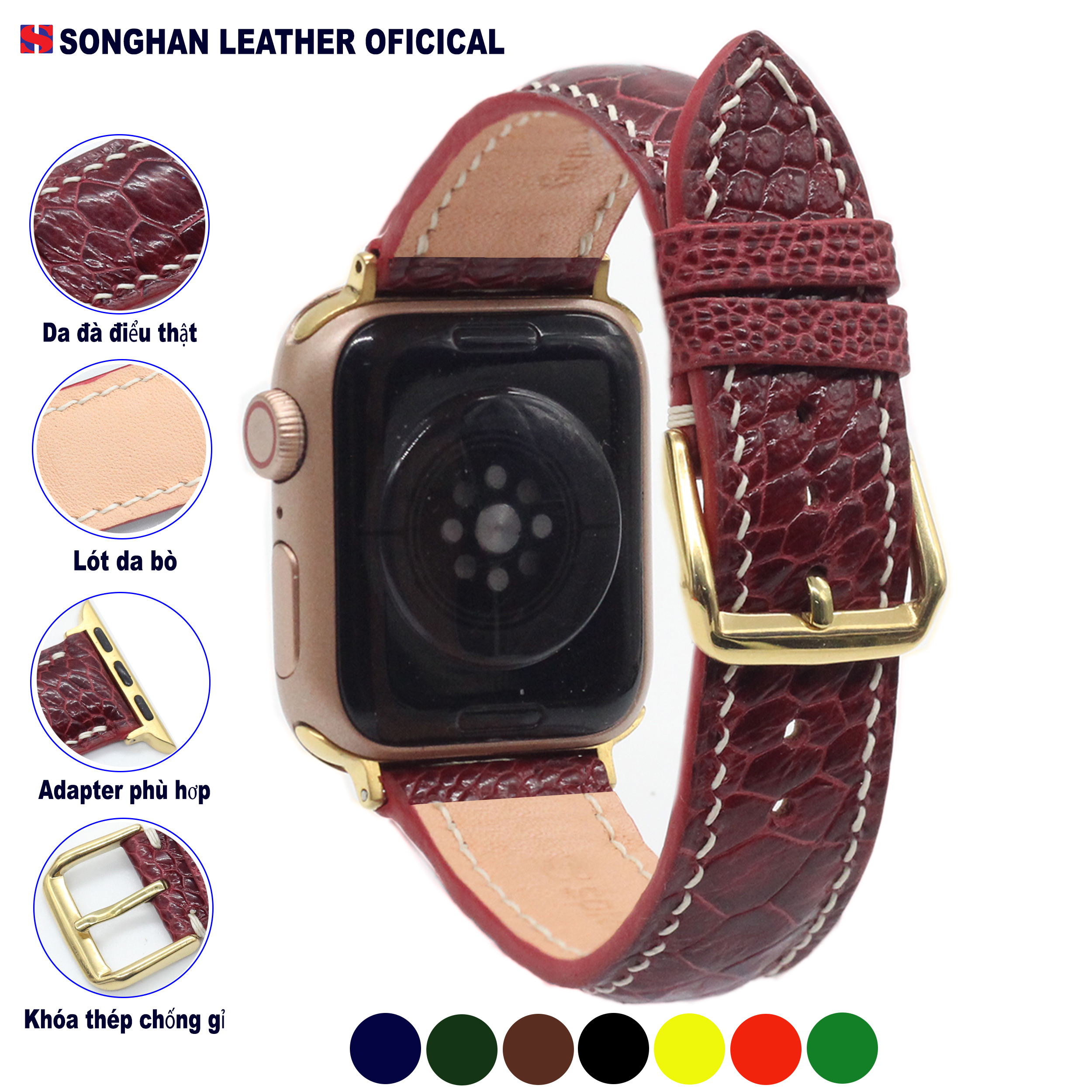 Dây da Apple Watch ĐÀ ĐIỂU handmade cao cấp nhiều màu chỉ trắng size 20mm, 22mm