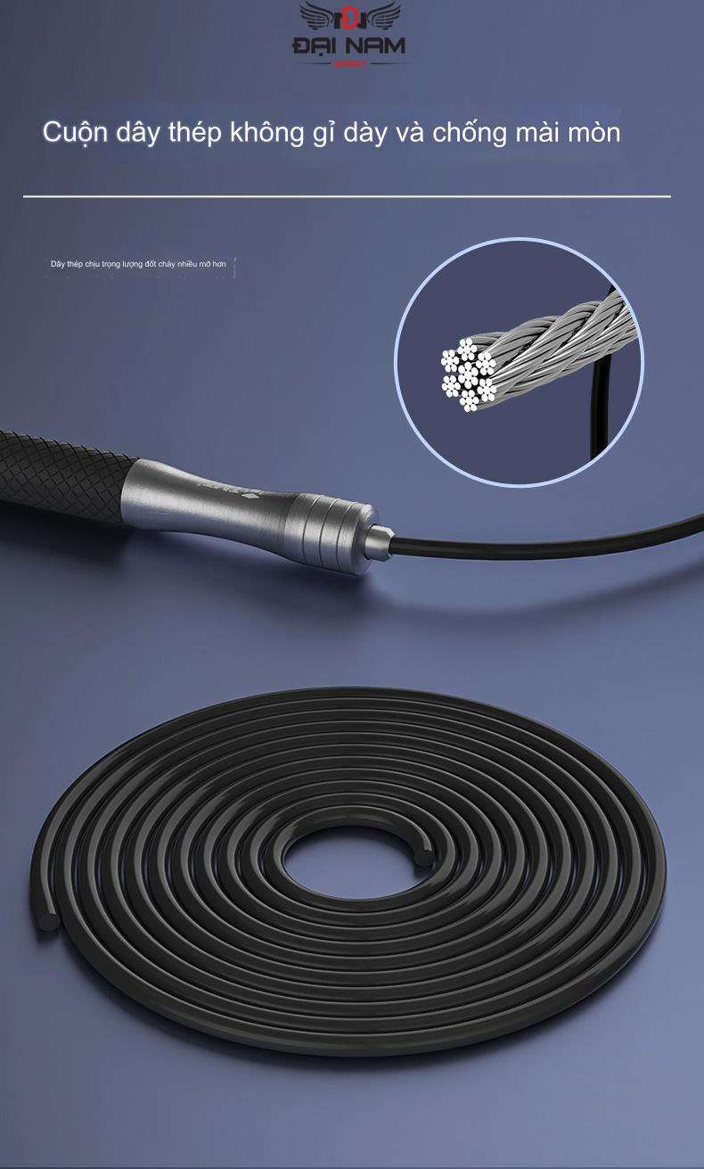 - Dây nhảy được làm bằng thép sợi bện vào nhau,bên ngoài bọc nhựa PVC chống bào mòn.