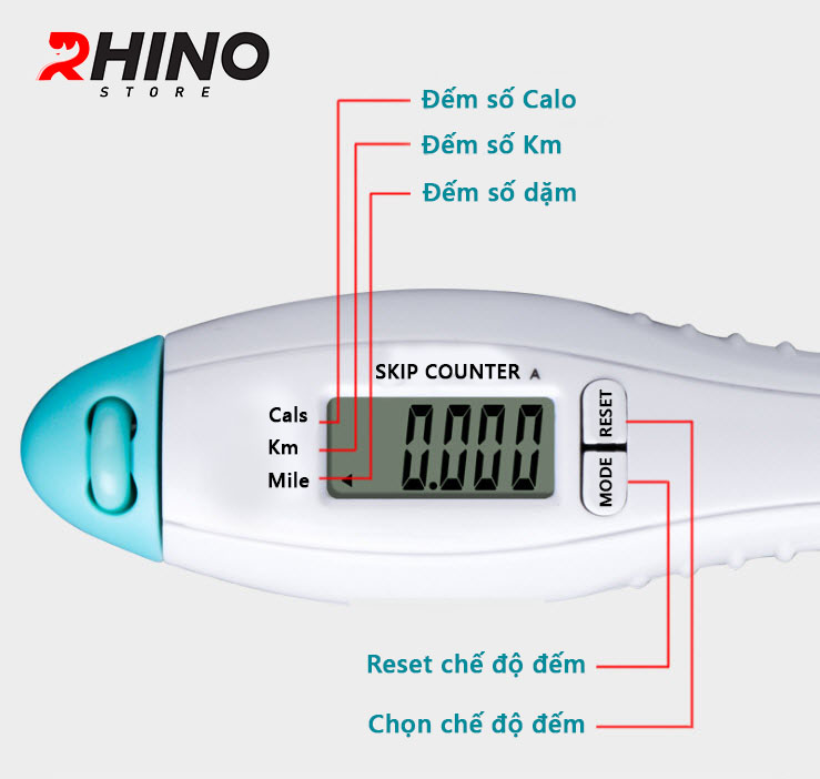 Chất liệu dây: PVC bọc dây thép cáp, chống nước, cách điện, độ bền cao Dây nhảy thể thao lõi thép cao cấp Rhino J101 tự động đếm số, tích hợp đo calo, quãng đường