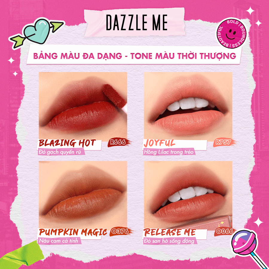 DAZZLE ME Mousse Lip Cream Màu sắc: - R666 Blazing Hot - Đỏ gạch quyến rũ - R757 Joyful - Hồng Lilac trong trẻo - O376 Pumpkin Magic - Nâu cam cá tính