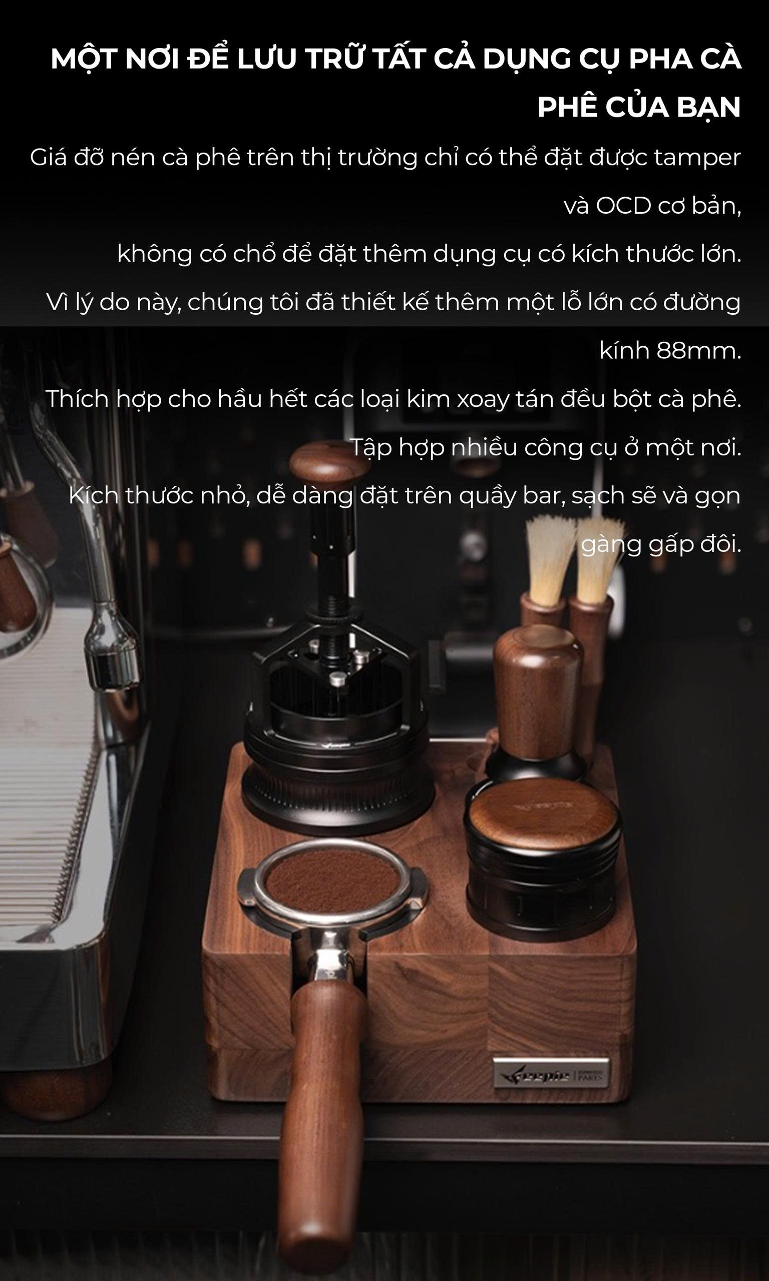 TẠI SAO BẠN NÊN CHỌN ĐẾ NÉN CÀ PHÊ GỖ ÓC CHÓ NAM MỸ? ️ Gỗ óc chó Nam Mỹ cao cấp, nổi bật với vân gỗ đẹp tự nhiên, độ bền cao, chống cong vênh, chịu lực tốt. ️ Bề mặt nhẵn mịn, không bám bẩn, chống thấm nước, giữ vệ sinh tối đa trong quá trình pha chế. ️ Dùng được cho hầu hết các loại tay cầm từ 51mm đến 58mm trên thị trường. ️ Hỗ trợ barista nén cà phê dễ dàng hơn, cân bằng hơn, tăng hiệu suất pha chế. ️ Thiết kế dựa trên chủng loại & kích thước của các thiết bị pha chế thông dụng. Tích hợp nhiều chức năng trong một sản phẩm như: Giá đỡ tay cầm nén cà phê Đỡ tamper, OCD,Kim Xoay(WDT) Ngăn đựng dụng cụ vệ sinh máy ️ Ngăn kéo linh hoạt với tích hợp nam châm từ tính giúp cố định chắc chắn. Khi di chuyển đế, ngăn kéo không bị trượt ra ngoài. ️ Đi kèm đai ốc điều chỉnh chiều cao, giúp tùy chỉnh phù hợp với nhiều loại tay cầm khác nhau. ️ Đế đỡ tương thích với hầu hết các loại tay cầm trên thị trường. ️ Tích hợp khe nhựa bảo vệ ngăn ngừa trầy xước đế khi sử dụng, ổn định và chống trầy.