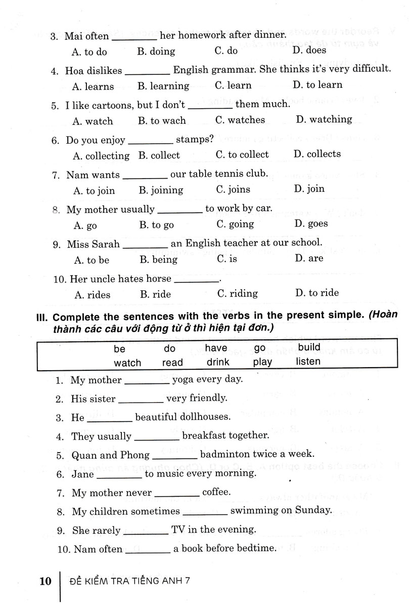 Sách bao gồm nhiều để kiểm tra với rất nhiều dạng khác nhau để các em luyện tập cách giải đề. Nội dung các đề kiểm tra bám sát các phần Ngữ âm, Từ vựng và Ngữ pháp, cũng như các chủ đề của mỗi bài học trong sách giáo khoa Tiếng Anh 7, hơn nữa còn được mở rộng thêm nên sẽ rất dễ dàng để các em vừa kiểm tra lại kiến thức đã học ở trường, vừa luyện tập và phát triển các kĩ năng phát âm, đọc, nói và viết.