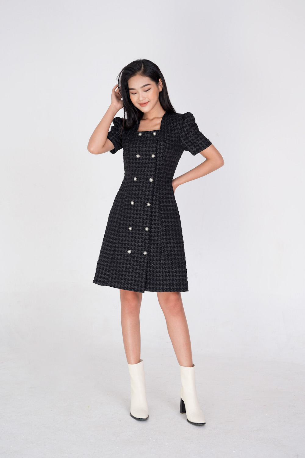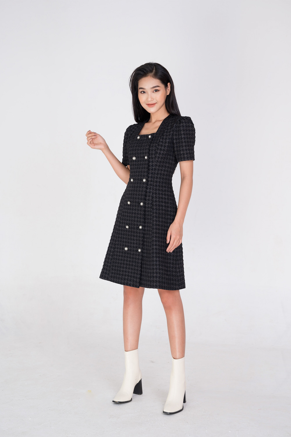Mua tại TiktokĐầm dáng ôm A, với 2 hàng khuy sang chảnh, thời trang. Đầm sử dụng chất liệu cotton xốp, hoạ tiết ô trám và houndstooth, có co giãn nhẹ