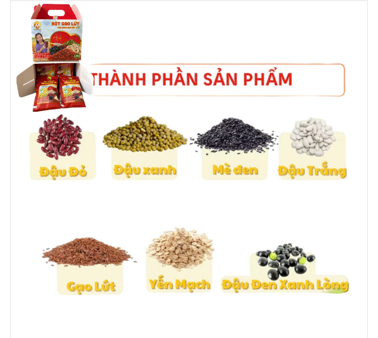 Thành Phần: Gạo lứt huyết rồng , Yến Mạch , Ngô , Đậu Xanh , lúa mạch , múa mỳ , canxi Công dụng : Trong ngũ Cốc có đường ISOMALT : Đây là loại