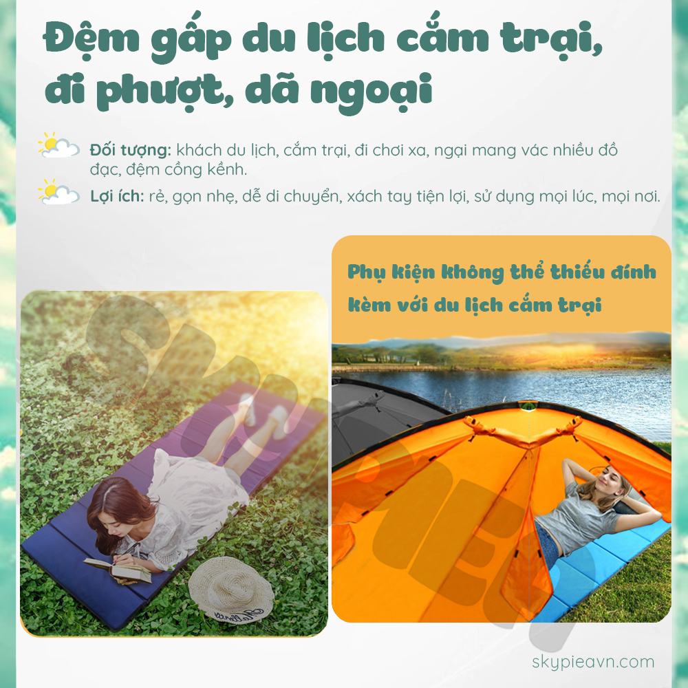 Mua tại TiktokĐệm Gấp Văn PHòng Đệm gấp đa năngđược người tiêu dùng biết đến là loại đệm có nhiều ưu điểm vượt trội nhất trong các dòng đệm hiện nay. Sở dĩ như vậy là vì đây là dòng đệm có thể gập gọn và cực kỳ tiện dụng trong vận chuyển. Nệm được thiết kế một cách nhỏ gọn và có qoai xách phù hợp với việc sử dụng cũng như cất giữ tại văn phòng làm việc. đệm gấp văn phòng, nệm đơn gấp gọn trải sàn ngủ trưa văn phòng, nệm du lịch cắm trại Ruột nệm được cấu tạo từ 100% bông gòn được ép chặt thành tấm mỏng với ưu thế của chất liệu là nâng đỡ cơ thể tối ưu, không xẹp lún và vô cùng thoáng mát. Vỏ nệm là loại vải 100& cotton thoáng mát và được chần một lớp gòn mỏng phía dưới tạo sự êm ái cũng như sang trọng cho sản phẩm. Kích thước đệm: 190cm x 70cm x 1.5cm dày Kích thước gấp gọn: 70x10x19 cm Vải Dù Chống Xước Tiết kiệm không gian Dễ dàng tháo rời vệ sinh Mặt trên bằng vải 100% Cotton mềm, mịn thoáng, tốt cho da. Mặt dưới bằng vải nilon giúp tránh mòn xước trong quá trình sử dụng. Đệm gấp làm 10 miếng nên đệm sau khi gấp kích thước rất gọn. Có bao đựng gấp gọn Phù hợp với nhân viên văn phòng, sinh viên ký túc xá, du lịch