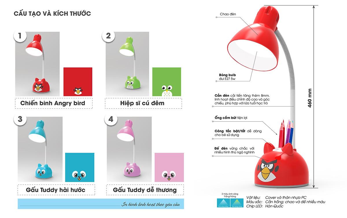 Model: Công suất: 6W Điện áp danh định: 220V/50Hz Độ rọi trung bình: 700 lux Hệ số trả màu: 80 Đèn bàn LED Rạng Đông bảo vệ thị lực Thiết kế sang trọng, màu sắc