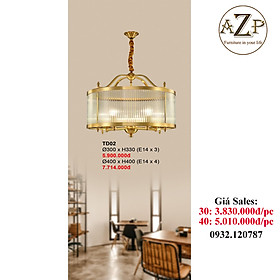 Mua tại TiktokĐÈN ĐỒNG / ĐÈN ỐP VÁCH / ĐÈN TRANG TRÍ / ĐÈN THẢ TRẦN / ĐÈN TREO TƯỜNG PHÒNG KHÁCH / PHÒNG NGỦ / ĐÈN TRANG TRÍ NHÀ HÀNG KHÁCH SẠN AZP-TD02 phong cách đương đại, hàng nhập khẩu AZP Thông tin sản phẩm: Mã sản phẩm: AZP-TD02 Chất liệu: Thân đèn được làm bằng ĐỒNG, chao thủy tinh cao cấp Kích thước: AZP-TD02-30: Ø300 x 330mm; AZP-TD02-40: Ø400 x 400mm Loại bóng: E14 Màu sắc: như hình Ứng dụng: trang trí phòng khách, phòng ăn, phòng ngủ, nhà hàng, khách sạn mang đến không gian sáng tạo, sang trọng và thêm phần tinh tế, hiện đại. Giá đã bao gồm bóng Bảo hành: 12 tháng, 1 đổi 1 Đến vơi AZP Quý khách hãy yên tâm: 100% các đơn hàng sẽ do chúng tôi sẽ gọi điện thoại để xác nhận trước khi giao hàng: >>> Quy trình mua hàng tại công ty chúng tôi: