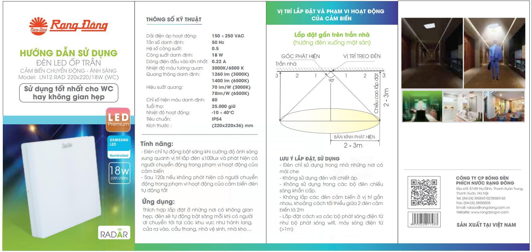 Đèn LED ốp nổi trần vuông cảm biến Rạng Đông 18W - LN12.RAD - tràn viền, á/s trắng