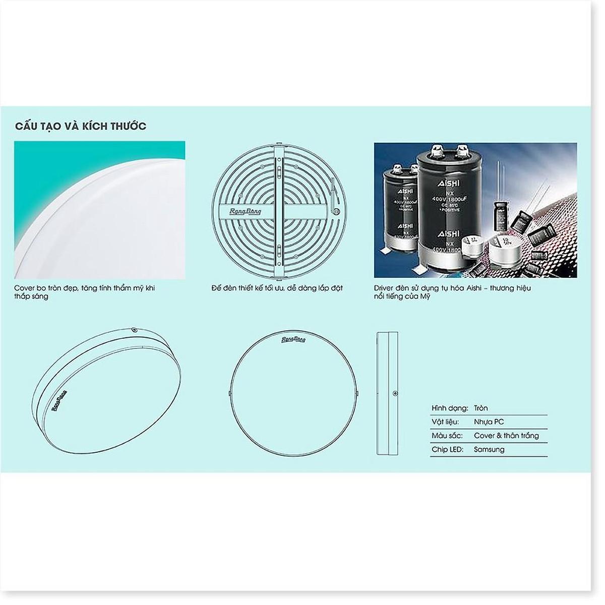 Model: D LN09L 225/18W Công suất: 18W Điên áp: 220V/50Hz Nhiệt độ màu: 6500K/3000K Quang thông: 1260 lm Kích thước (ØxH): (225x40) mm *** ĐẶC TÍNH SẢN PHẨM Sử dụng Chip LED Samsung đạt