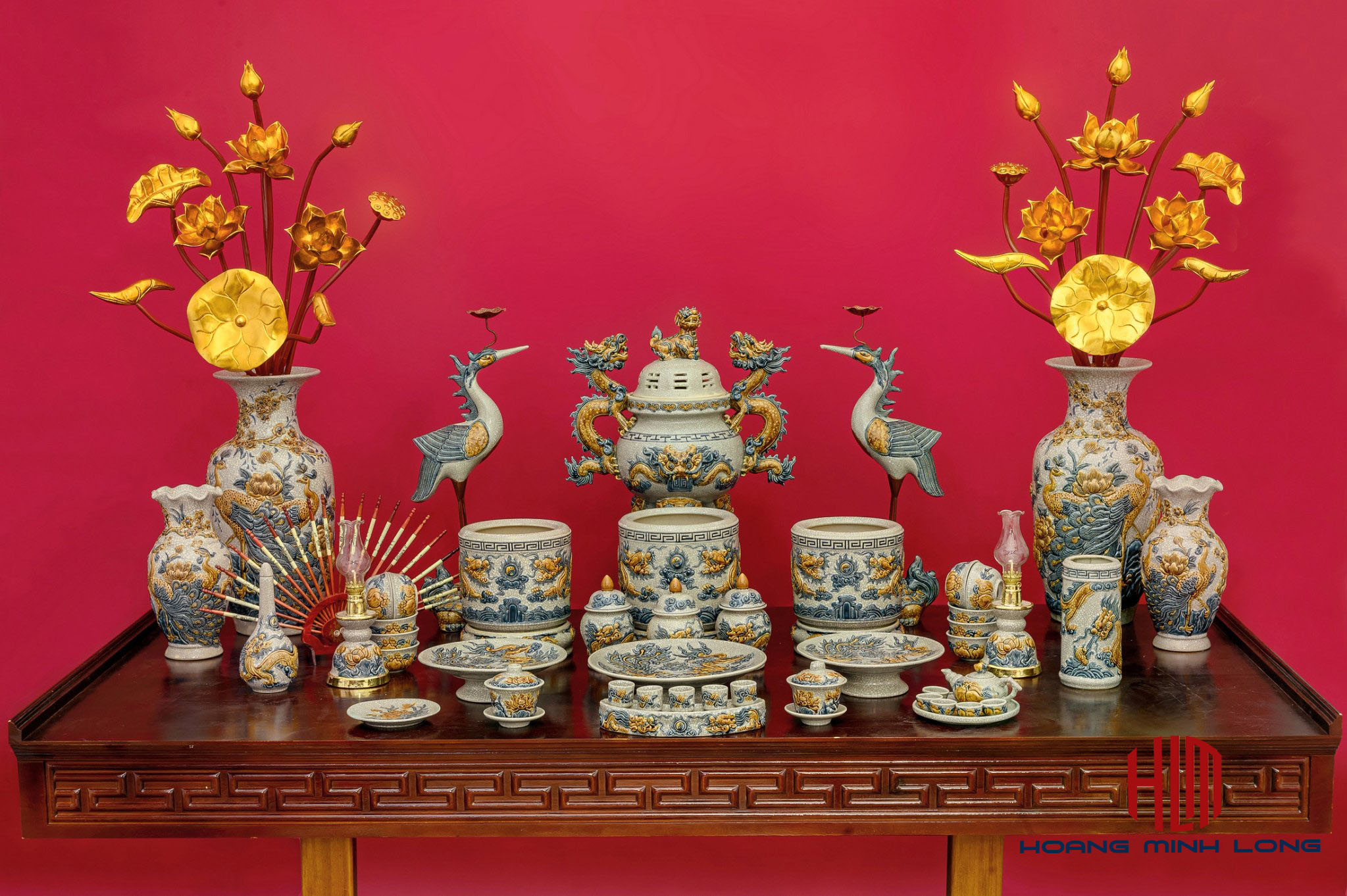 Combo đồ thờ men rạn hoa sen đắp nổi 11 chi tiết dành cho ban thờ thần tài