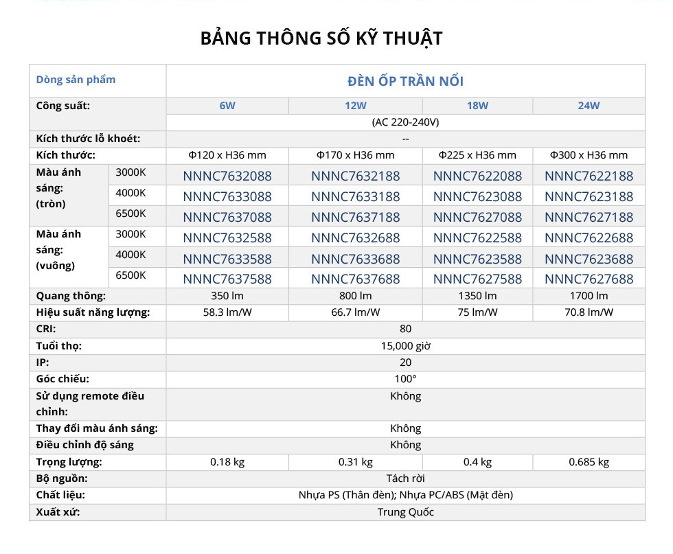 Nguồn điện danh định: 220V/50Hz Tuổi thọ của đèn: 25 000 giờ Màu ánh sáng: 3000/4000/6500K Hệ số trả màu (CRI): 80 Chiều dài x Chiều rộng 247 x 247 mm Chiều cao: 39 mm