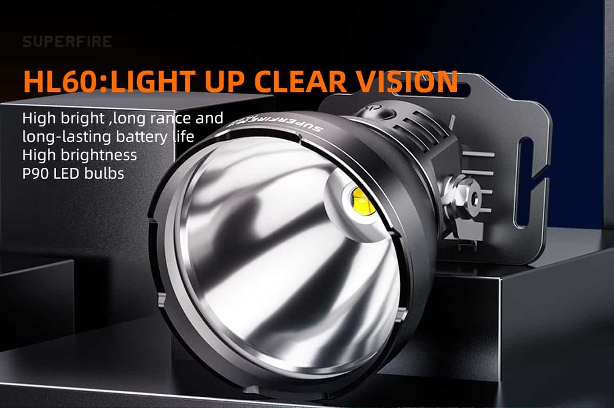 Đèn pin đội đầu Superfire HL60 được thiết kế với chóa lớn cho phép tập trung ánh sáng khiến nó có thể chiếu sáng một khoảng cách lên đến 400m