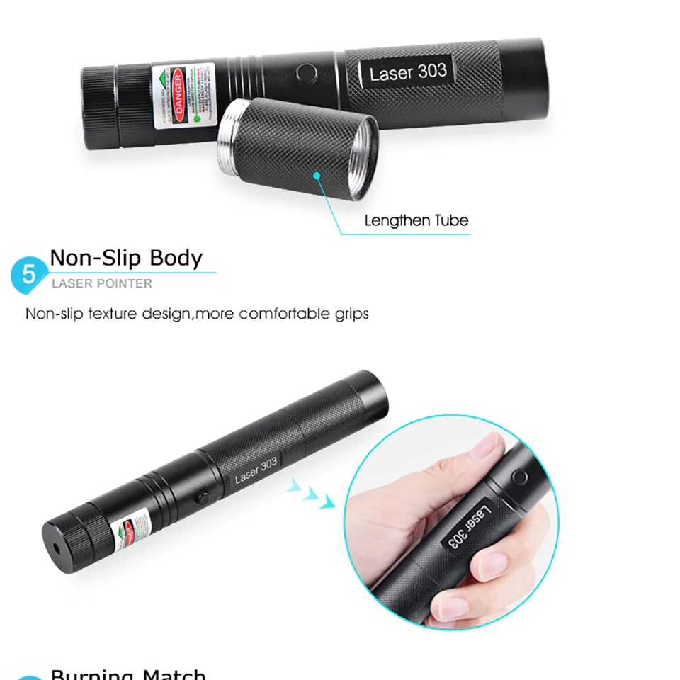 - Đèn laser 303 công suất 5.000mw có thể phát tia sáng xanh/đỏ (bước sóng 532nm) xa hàng km.