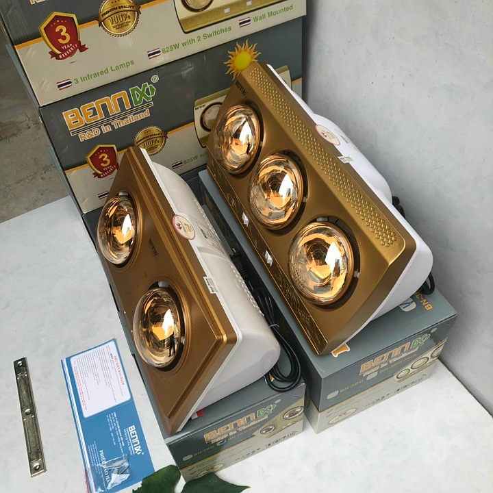Mua tại TiktokĐèn sưởi nhà tắm Bennix 3 bóng BN-3BG - Hàng chính hãng bảo hành 3 năm Mã sản phẩm: BN-3BG Thương hiệu: Bennix Xuất xứ: Thái Lan Sản xuất: VIỆT NAM Kích thước: 535 x 257 x 275 (mm) (dài x rộng x cao) | Trọng lượng: 2.1kg Kích thước đóng hộp: 55 x 35 x 30 cm | Trọng lượng hộp: 2.3kg Chất liệu: Vỏ nhựa ABS nguyên sinh cách điện Màu sắc : vàng gold Công suất: 825W | Điện áp: 220V - 50hz Tiêu chuẩn đui bóng E27 Công tắc: 2 công tác dành cho 3 bóng Điều khiển từ xa: Không Đặc điểm nổi bật