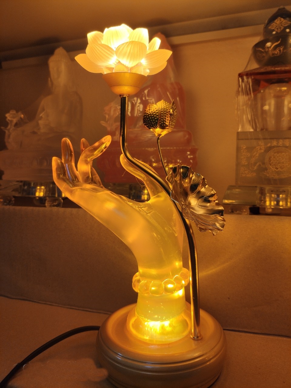 Cặp đèn thờ tay Phật cầm hoa sen với chất liệu giả lưu ly đúc trong và sáng tinh tế, kết hợp với chất liệu đồng và đá lưu ly nguyên chất làm đèn sáng