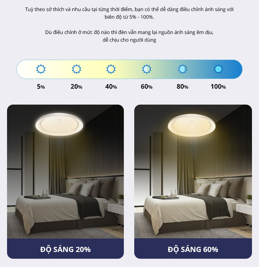 - Dù điều chỉnh ở mức độ nào thì đèn vẫn mang lại cảm giác êm dịu, dễ chịu cho người dùng.