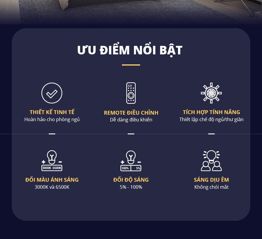 - Được thiết kế dành riêng cho phòng ngủ, HHXZ301188 có quang thông 2400lm nên ánh sáng dù chỉnh ở mức tối đa vẫn vô cùng dịu êm, không chói mắt và khó chịu.