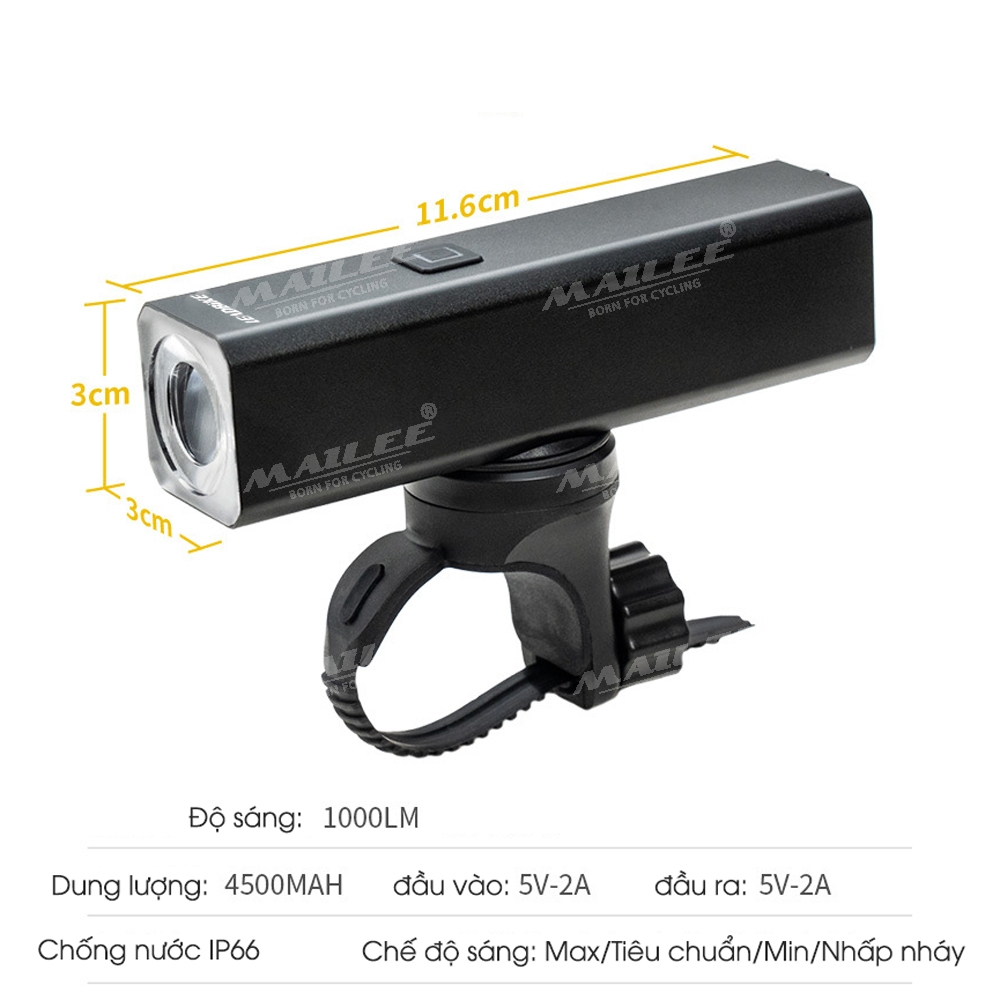 Đèn Trước Xe Đạp Chiếu Sáng Cao Cấp Chống Nước P-023 dung lượng 5200mAh Gắn tay lái, sạc Type-C, sáng max 10h, Có Hỗ trợ Sạc Khẩn Cấp - Mai Lee Thông số kỹ thuật