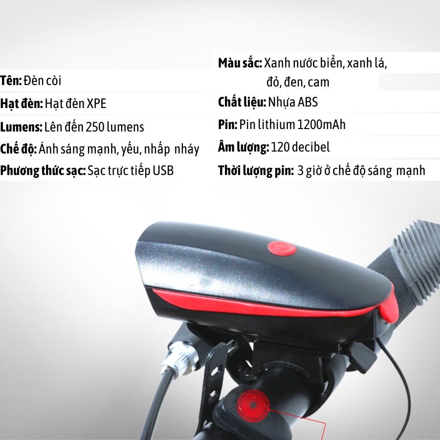 Mua tại TiktokĐèn xe đạp thể thao siêu sáng có còi, đèn pin gắn xe đạp Thông sin sản phẩm và hướng dẫn sử dụng Đèn xe đạp có còi sạc usb chống nước: Thiết kế của đèn xe đạp kết hợp đèn hậu kết hợp đèn hậu thể thao được làm bằng nhựa cao cấp kết hợp cao su theo tiêu chuẩn chống nước ip44 đủ để hoạt động trong bất kỳ thời tiết như nắng nóng hay mưa rào **Đèn xe đạp thể thao có 2 nút bấm Sản phẩm đèn xe đạp Sử dụng pin liền sạc lại qua cổng usb dung lượng pin lên đến 1200mah theo công bố của nhà sản xuất pin có thể sạc trên 500 lần và khi sạc đầy (rơi vào khoảng 2 giờ) Tùy chế độ thời gian sử dụng sẽ khác nhau chế độ cường độ sáng (lumen) 1-Thời gian sáng mạnh 250LM 2.5H 2-Sáng mờ 125LM 5.0H 3-Nháy sáng 250LM 3.5H ÁNH SÁNG: đèn xe đạp kết hợp đèn hậu sử dụng bóng led công suất 3w hiệu suất cao với 3 chế độ sáng giúp người dùng di chuyển dễ dàng trong đêm tối CAM KẾT 100% Đèn xe đạp có còi sạc usb chống nước: Mẫu đèn này trên thị trường hiện tại có 3 loại và phụ kiện xe đạp dododios cam kết bán ra loại hàng cao cấp nhất tới tay khách hàng Phụ kiện xe đạp thể thao dododios cam kết sản phẩm Đèn xe đạp có còi sạc usb chống nước bán ra 100% được kiểm tra hoạt động bình thường trước khi gửi đi cho quý khách. Các bạn yên tâm nhận hàng bất cứ vấn đề phát sinh khi sử dụng sản phẩm đèn xe đạp này bạn vui lòng inbox giúp dododios. Khi nhận hàng quý khách vui lòng quay video mở hộp sản phẩm giúp dododios nếu sản phẩm bị lỗi dododios sẽ đổi hàng hoặc hoàn tiền lại cho quý khác CÁM ƠN SỰ TIN TƯỞNG TỪ CÁC BẠN. SHOP RẤT MONG NẾU CÁC BẠN HÀI LÒNG VỀ SẢN PHẨM VUI LÒNG CHO SHOP XIN 1 ĐÁNH GIÁ 5 SAO KÈM BÌNH LUẬN VÀ 5 HÌNH ẢNH ĐỂ dododios CÓ THÊM ĐỘNG LỰC PHỤC VỤ CÁC BẠN TỐT HƠN NỮA :)) =>Sản phẩm đèn xe đạp rất tiện lợi cho các bác đạp xe vào những lúc sáng sớm chắc chiều tối tránh được va chạm từ xe phía sau khi không nhìn thấy báo hiệu từ xe đạp của các bác. Đèn xe đạp thể thao này có dung lượng pin rất tốt nên các bác cứ yên tâm khi phải đạp đường dài từ 2-3 tiếng mà không lo hết pin đèn xe đạp các bác nhé !! 2600mAh có mạch bảo vệ (kèm theo) Chống nước: IPX6, chịu va đập: 1m Bảo hành 1 năm, 1 đổi 1 do lỗi nhà sản xuất Toàn bộ thông số của đèn được sản xuất theo Tiêu Chuẩn ANSI /PLATO FL1 do Tổ chức thương mại đèn pin chiếu sáng Hoa Kỳ ban hành.