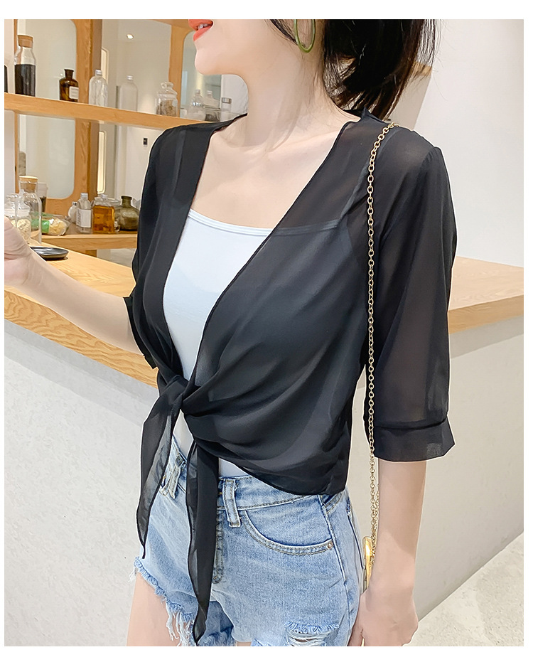 Áo Khoác Cardigan Dài Tay với Dây Buộc Lụa Mềm Mại, Chất Liệu Voan