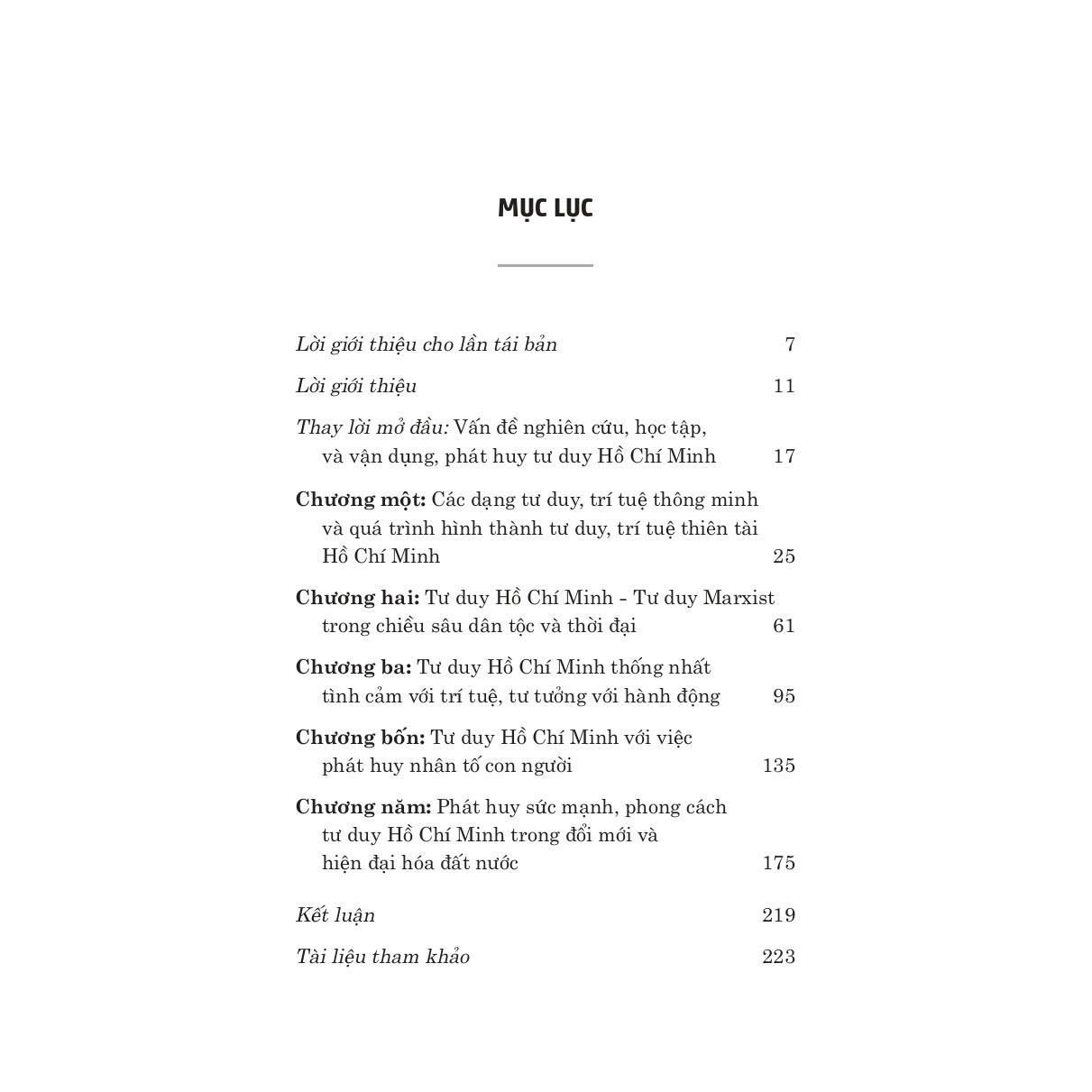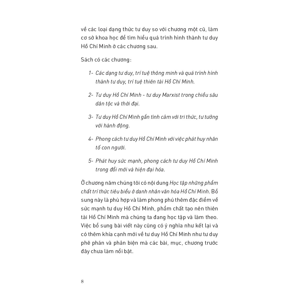 Tác phẩm Sức mạnh tư duy Hồ Chí Minh được hoàn thành là tiếp tục hướng nghiên cứu triết học và tâm lý học lãnh đạo về tư duy và trên cơ sở một số chuyên đề nghiên cứu của tác giả, tập trung vào ba chủ đề, bốn góc độ từ khái quát đến cụ thể. Trong mỗi vấn đề sau đây, tác giả chỉ đề cập tới một vài khía cạnh chính.