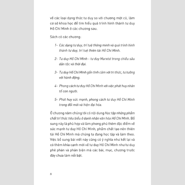 Trong quá trình nghiên cứu và trình bày những vấn đề đó, tác giả không chỉ làm rõ về phẩm chất tư duy Hồ Chí Minh mà còn qua đó làm rõ thêm lý luận về tư duy, nhất là góc độ năng lực và phong cách tư duy của vị lãnh tụ cách mạng này.