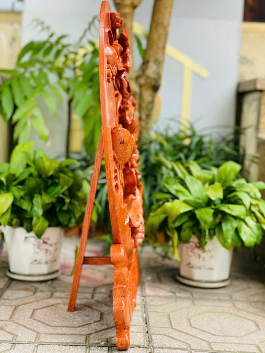Đĩa hoa hoa sen cá chép được làm bằng chất liệu gỗ hương đá liền khối tự nhiên 100% Kt mặt tròn 50+chân đế cao 12 dầy 5cm =Tổng cao cả chân là 62cm _ Đĩa được chạm khắc tỉ mỉ tinh xảo kỳ công .Đi hầu hết tất cả mọi chi tiết góc ngách nội dung hoa văn của tượng đều được gọt tỉa chỉnh sửa sắc nét hoàn toàn bằng tay thủ công .Đĩa được làm và hoàn thiện do bàn tay khối óc tài hoa .Từ những người thợ giàu kinh nghiệm cũng như tay nghề cao trong làng nghề truyền thống .