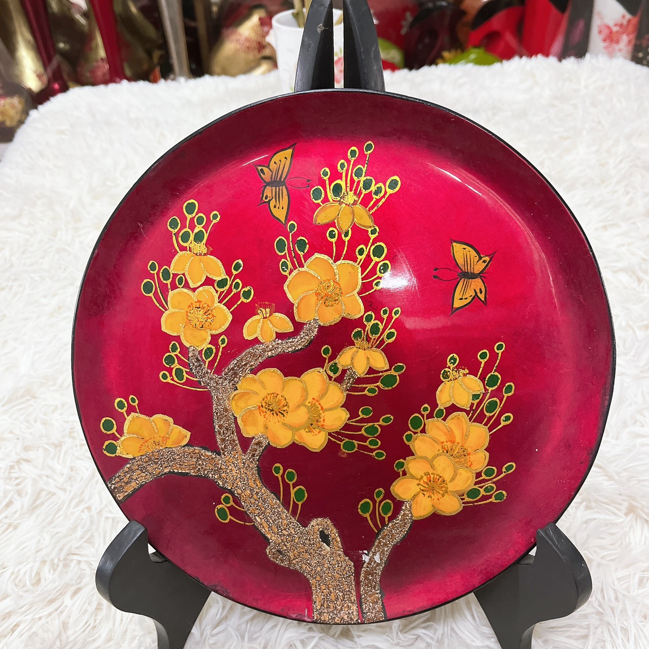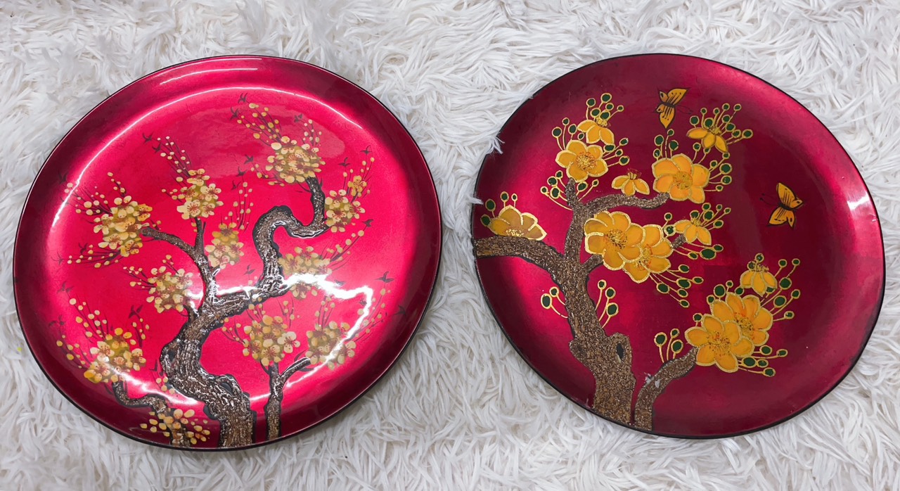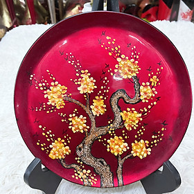 Dĩa sơn mài vẽ hoa mai vàng có cốt gỗ MDF, kích thước phi 25 cm.