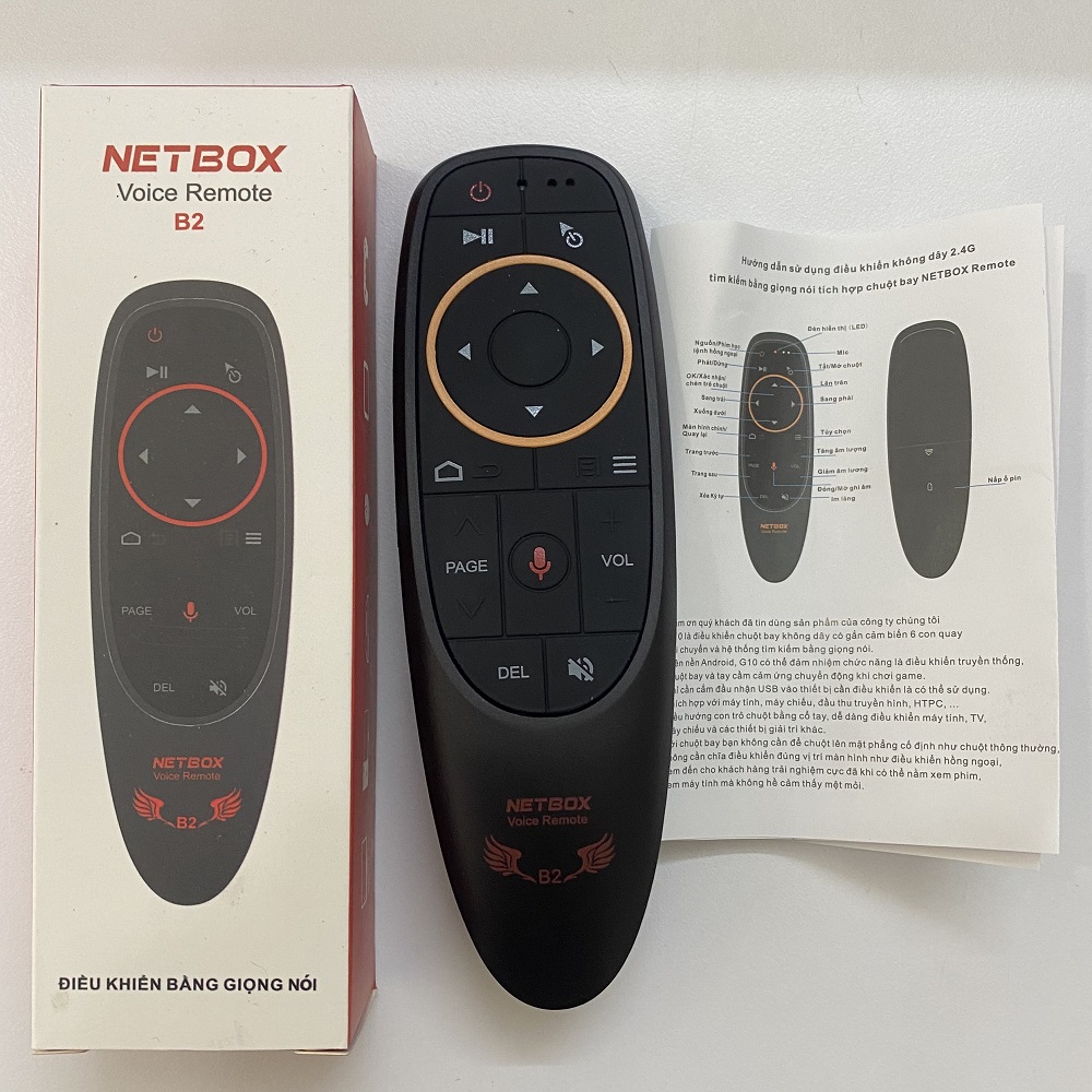 Điều khiển voice , bay NETBOX B2 ,KÈM PIN AAA- SẢN PHẨM CHÍNH HÃNG SẢN PHẨM ĐƯỢC PHÂN PHỐI BỞI CTY ĐIỆN TỬ HOÀNG THỊNH NETBOX B2 – Điều khiển voice kiêm chuột bay thông minh NETBOX B2 là model điều khiển voice kiêm chuột bay dành cho Android Box, HD Box đang được đông đảo người dùng tin dùng. Sản phẩm thích hợp cho mọi gia đình, đặc biệt có người già, trẻ nhỏ khi có nhu cầu tìm kiếm bằng giọng nói nhanh chóng, tiện dụng hơn. Chỉ cần nhấn và nói, người dùng có thể kích hoạt trợ lý giọng nói hoặc tìm các nội dung video đúng theo nhu cầu sử dụng trên các ứng dụng, thay vì thực hiện lần lượt từng thao tác như truyền thống. Chức năng giọng nói trên điều khiển  NETBOX B2 khá đơn giản và dễ sử dụng. Bạn chỉ cần nhấn nút có biểu tượng micro rồi nói, thiết bị sẽ tìm ra các kết quả tìm kiếm đúng nhu cầu. Sản phẩm sử dụng kết nối không dây thông qua một đầu thu phát USB. Tính năng nổi bật của điều khiển voice kiêm chuột bay NETBOX B2 Tích hợp nút điều khiển giọng nói, cực nhạy với giọng nói 3 miền, ấn chạm một lần để ra lệnh tìm kiếm. Điều khiển con trỏ thông minh nhờ vào tính năng chuột bay được tích hợp. NETBOX B2 sở hữu nút nguồn có chức năng học lệnh. Phím bấm được thiết kế bằng cao su mềm tay, thoải mái khi sử dụng. Tương thích với nhiều dòng Đầu HD-4K, Android TV Box, Smart TV khác nhau. Kết nối không dây qua đầu thu phát USB 2.0, phạm vi sử dụng lên tới ~15m. Thiết kế gọn nhẹ, dễ dàng sử dụng. Thông số kỹ thuật Model NETBOX B2 Phạm vi điều khiển ~15 mét Nguồn điện 02 viên pin chuẩn AAA Kích thước 12CM x 4CM x 3CM MỘT SỐ HÌNH ẢNH THỰC TẾ SẢN PHẨM