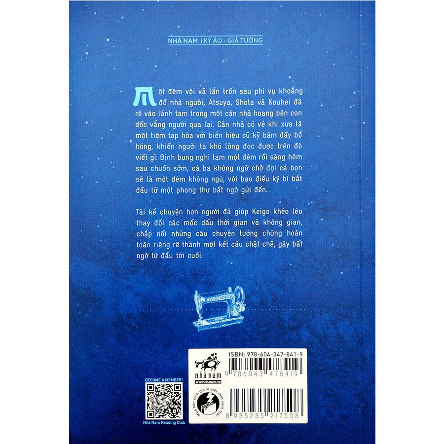 Mua tại TiktokMột đêm vội vã lẩn trốn sau phi vụ khoắng đồ nhà người, Atsuya, Shota và Kouhei đã rẽ vào lánh tạm trong một căn nhà hoang bên con dốc vắng người qua lại. Căn nhà có vẻ khi xưa là một tiệm tạp hóa với biển hiệu cũ kỹ bám đầy bồ hóng, khiến người ta khó lòng đọc được trên đó viết gì. Định bụng nghỉ tạm một đêm rồi sáng hôm sau chuồn sớm, cả ba không ngờ chờ đợi cả bọn sẽ là một đêm không ngủ, với bao điều kỳ bí bắt đầu từ một phong thư bất ngờ gửi đến…