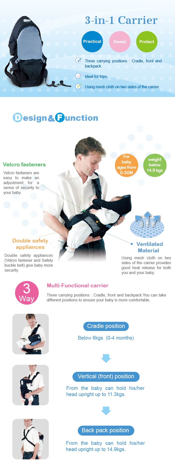 Địu Em Bé 3 Trong 1 Kuku KU2152 giúp bạn địu bé ở 3 tư thế: nằm ngang, trước ngực và thẳng đứng sau lưng thật dễ dàng, phù hợp với từng giai đoạn phát triển của bé.