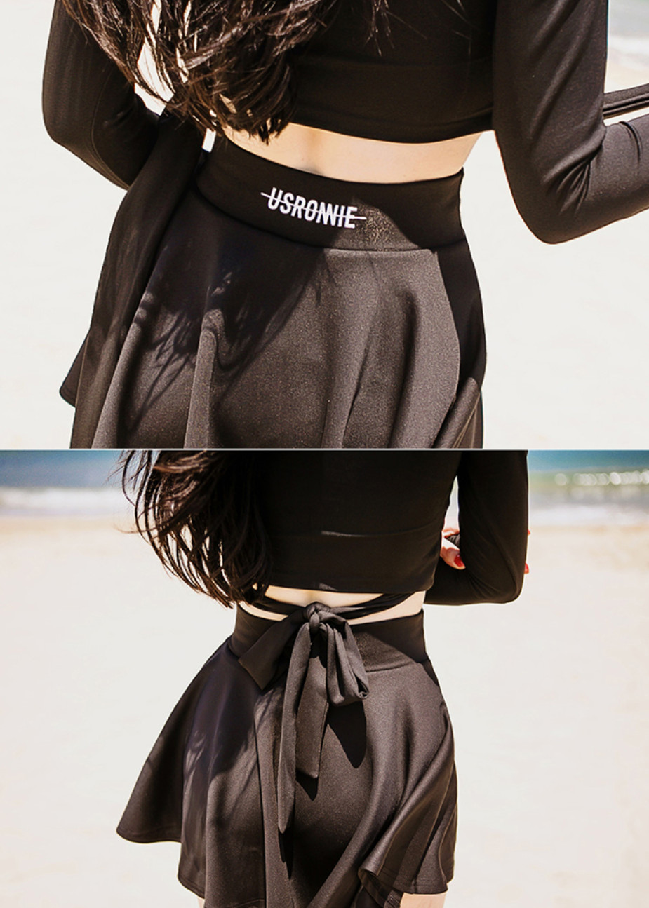 - Thiết kế hai mảnh: áo lưng cao croptop, váy xòe kèm quần phía trong