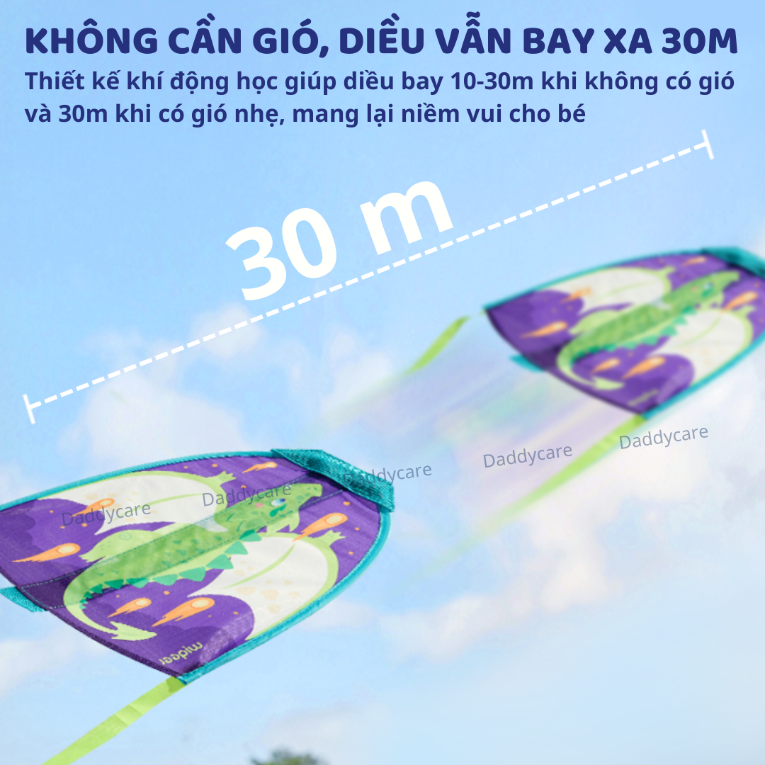 - KHÔNG CẦN GIÓ VẪN BAY XA ĐẾN 30 MÉT Với thiết kế khí động học, diều có thể bay lên dù không có gió mạnh. Khi không có gió, diều bay được 10-30m, còn khi có gió nhẹ, diều có thể bay xa tới 30m, mang đến cho con những phút giây vui vẻ.