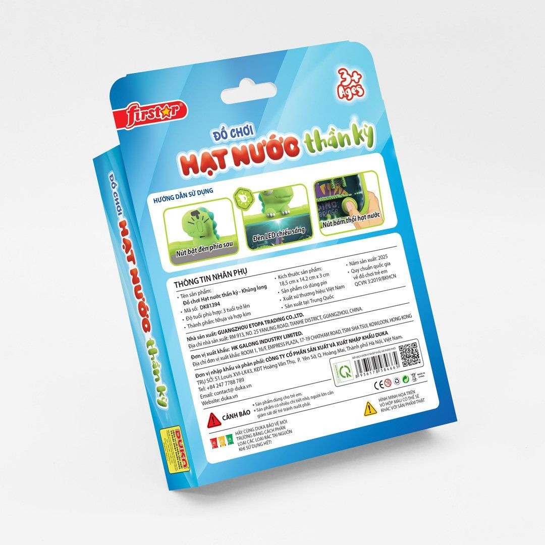 Đồ chơi Hạt nước thần kỳ - Khủng long   Đồ chơi Hạt nước thần kỳ..là món đồ chơi vật lý giúp bé tránh xa điện thoại và các thiết bị điện tử gây hại cho não bộ và mắt, bộ đồ chơi được thiết kế đầy màu sắc, bền đẹp với các nút bấm nhạy và đèn led bật sáng khi chơi giúp bé các bé có những trải nghiệm thú vị với hình chú khủng long ngộ nghĩnh. Phù hợp với các bé trên 3 tuổi với các lợi ích nổi bật như: Phát triển Kỹ năng thao tác của đôi tay  Phát triển Kỹ năng nhận biết màu sắc Phát triển Kỹ năng cầm nắm, phản xạ chính xác   Món đồ chơi sẽ là công cụ giải trí bổ ích cho bé sau nhưng giờ phút học tập căng thẳng. Thông tin sản phẩm: Thương hiệu : DUKA Xuất xứ thương hiệu : Việt Nam Độ tuổi: trên 3 tuổi Mã barcode: 8936178584665 Chất liệu: Nhựa cao cấp ABS+ cao su, an toàn cho trẻ Kích thước: 18.5 cm x 14.2 cm x 3 cm Quy cách : Hộp giấy  Sản xuất tại : Trung Quốc Năm sản xuất : 2025 Tiêu chuẩn quốc gia về đồ chơi trẻ em QCVN 3:2019/BKHCN. Chứng minh hợp lệ số:  Cảnh báo an toàn: Sản phẩm dùng cho trẻ em Sản phẩm có nhiều chi tiết nhỏ, không dùng cho trẻ dưới 3 tuổi để tránh nuốt phải.   Đồ chơi Hạt nước thần kỳ - Kỳ lân   Đồ chơi Hạt nước thần kỳ..là món đồ chơi vật lý giúp bé tránh xa điện thoại và các thiết bị điện tử gây hại cho não bộ và mắt, bộ đồ chơi được thiết kế đầy màu sắc, bền đẹp với các nút bấm nhạy và đèn led bật sáng khi chơi giúp bé các bé có những trải nghiệm thú vị với hình chú kỳ lân ngộ nghĩnh. Phù hợp với các bé trên 3 tuổi với các lợi ích nổi bật như: Phát triển Kỹ năng thao tác của đôi tay  Phát triển Kỹ năng nhận biết màu sắc Phát triển Kỹ năng cầm nắm, phản xạ chính xác   Món đồ chơi sẽ là công cụ giải trí bổ ích cho bé sau nhưng giờ phút học tập căng thẳng. Thông tin sản phẩm: Thương hiệu : DUKA Xuất xứ thương hiệu : Việt Nam Độ tuổi: trên 3 tuổi Mã barcode: 8936178584658 Chất liệu: Nhựa cao cấp ABS+ cao su, an toàn cho trẻ Kích thước: 18.5 cm x 14.2 cm x 3 cm Quy cách : Hộp giấy  Sản xuất tại : Trung Quốc Năm sản xuất : 2025 Tiêu chuẩn quốc gia về đồ chơi trẻ em QCVN 3:2019/BKHCN. Chứng minh hợp lệ số:  Cảnh báo an toàn: Sản phẩm dùng cho trẻ em Sản phẩm có nhiều chi tiết nhỏ, không dùng cho trẻ dưới 3 tuổi để tránh nuốt phải.