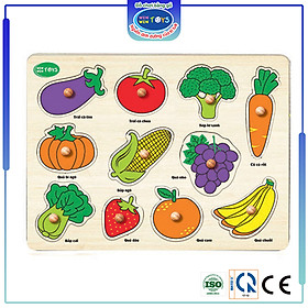 Đồ chơi bao gồm những miếng ghép mang hình các loại rau củ quả như: cam, nho, chuối, bí đỏ, cà rốt, cà tím, bắp cải… có họa tiết sinh động như thật. Bên trên mỗi miếng ghép có nút để bé dễ dàng cầm nắm.