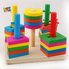 - Bộ đồ chơi xếp hình 5 trụ cột bằng gỗ giúp bé linh hoạt xử lí giữa tay , mắt và bộ não nhờ các trở ngại trên mỗi trụ cột.