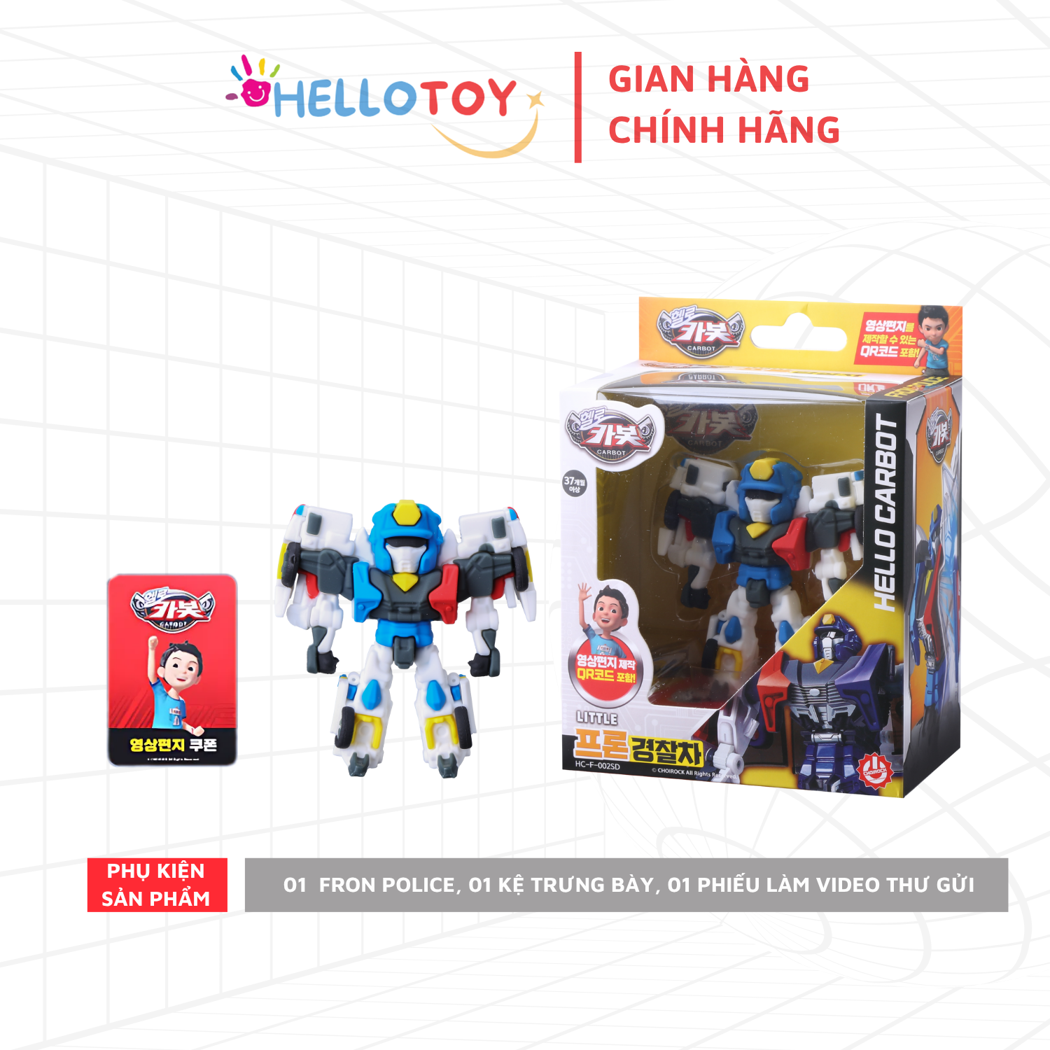 - An toàn cho trẻ: Đảm bảo an toàn khi sử dụng, phù hợp với lứa tuổi trẻ em. Chú ý: Thông tin chi tiết về chất liệu và đặc tính kỹ thuật không được cung cấp trong dữ liệu sản phẩm. 1.Tên sản phẩm: Đồ chơi trẻ em 2.Tên hàng hóa: [HELLO CARBOT] LITTLE FRON POLICE 3.Mã hàng hóa: HC-F-002SD 4.Thành phần: Nhựa PVC 5.Thông số kỹ thuật: 12072130 (mm), 145g, không dùng pin 6.Tuổi sử dụng: Trên 37 tháng 7.Hướng dẫn sử dụng: chơi và trưng bày 8.Cảnh báo: Không thích hợp cho trẻ em dưới 37 tháng, có các chi tiết nhỏ!