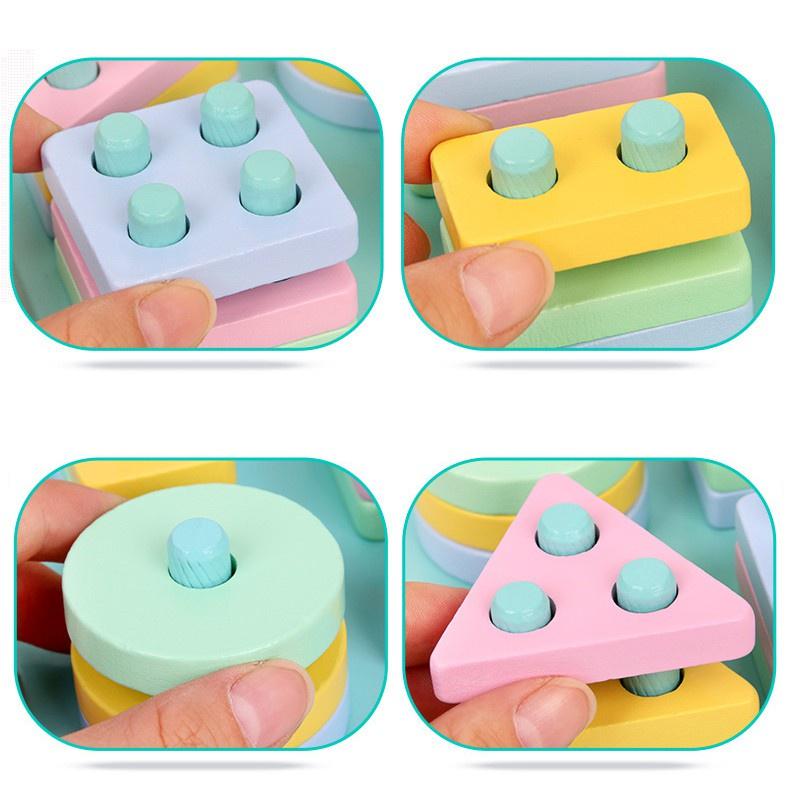 Đồ Chơi Gỗ Tháp Thả Hình Khối 3D, 4 Trụ Với Nhiều Màu Sắc