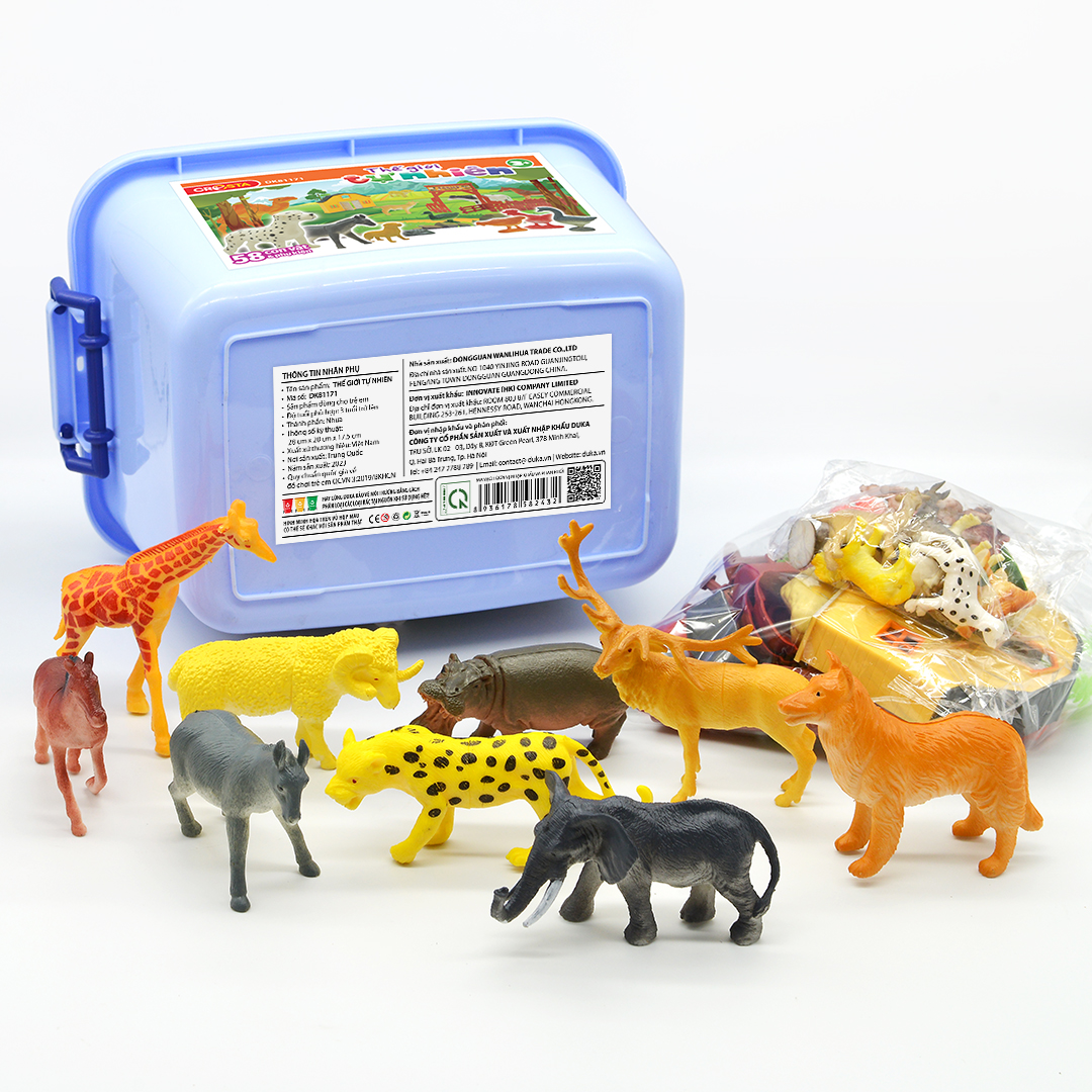 Thế giới tự nhiên - Set 58 con vật và phụ kiện,DK 81170       Set mô hình con vật 58 chi tiết bao gồm : 20 con vật to( Báo, Gấu, Hổ…), 20 con vật nhỏ( Gà, Thỏ, Lợn…) & 18 Chi tiết Tiểu Cảnh. - Mô Hình Con Vật làm từ nhựa PP, ABS an toàn, sơn chất lượng cao chuyên dùng cho đồ chơi trẻ em không phai, không dính, màu sắc tươi sáng, không góc cạnh. Kèm theo một cái hộp siêu đẹp để con đựng vào sau khi chơi. - Mô hình động vật 58 chi tiết mô tả thật và chân thực nhất các con vật nhưng với kích thước được tối giản. Qua việc quan sát, sờ chạm để học nhận biết nhiều bạn động vật khác nhau - Tạo nên một vườn thú mini sinh động bằng các mô hình và tiểu cảnh có sẵn, giúp bé phát triển các giác quan và hòa mình vào thế giới tự nhiên sinh động. Thông tin sản phẩm: