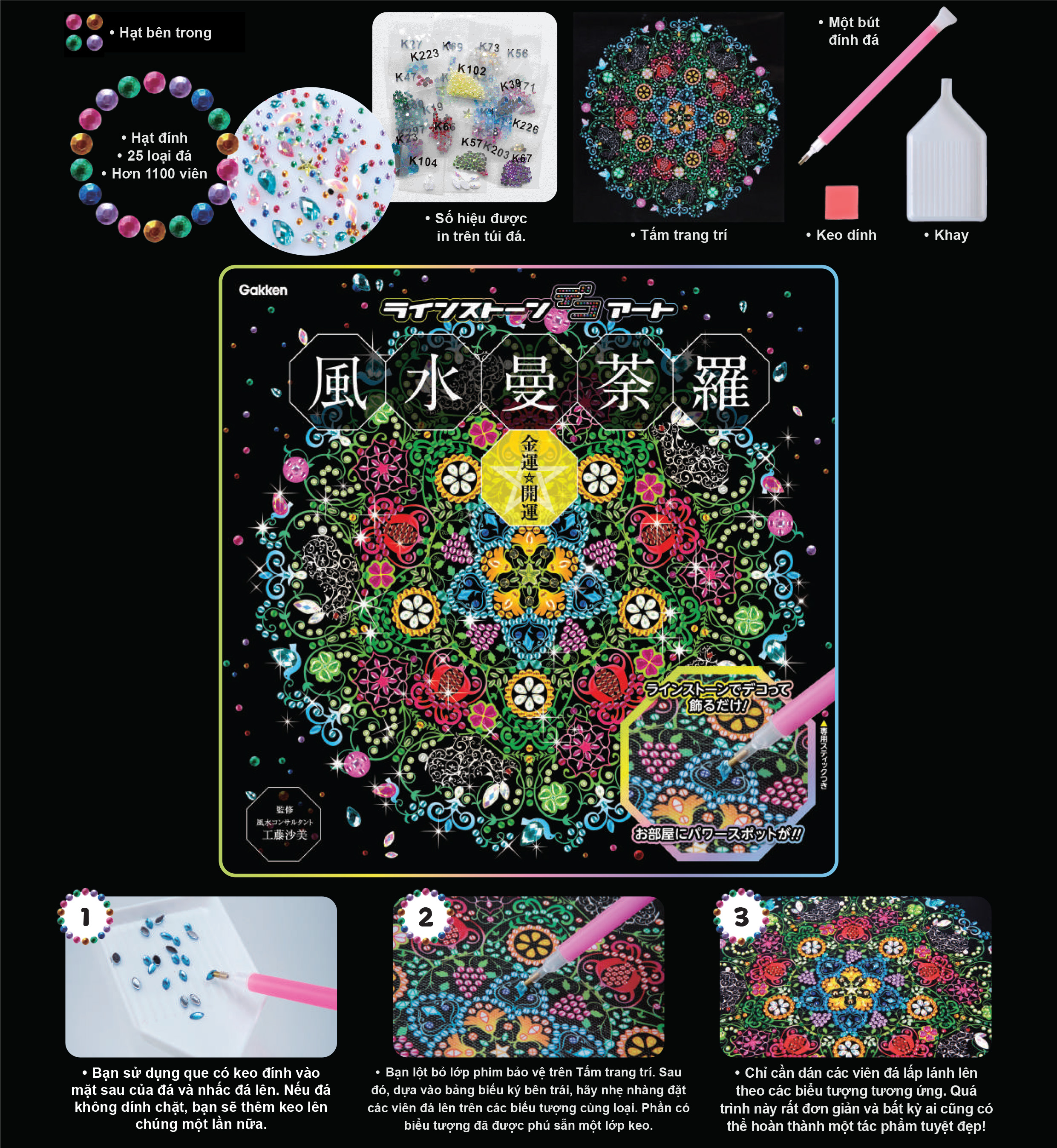 Chất liệu: Nhựa, vải, hạt màu Kích thước gói: 170 x 15 x 270 Độ tuổi: 15 tuổi trở lên Mandala là biểu tượng của vũ trụ vô tận. Nó mang lại sự êm dịu và giúp thư giãn. Bằng cách sắp xếp cẩn thận các viên đá quý và gửi những lời ước nguyện vào từng viên đá, chúng ta có thể cân bằng não bộ, giải phóng tâm trí và thân thể khỏi căng thẳng