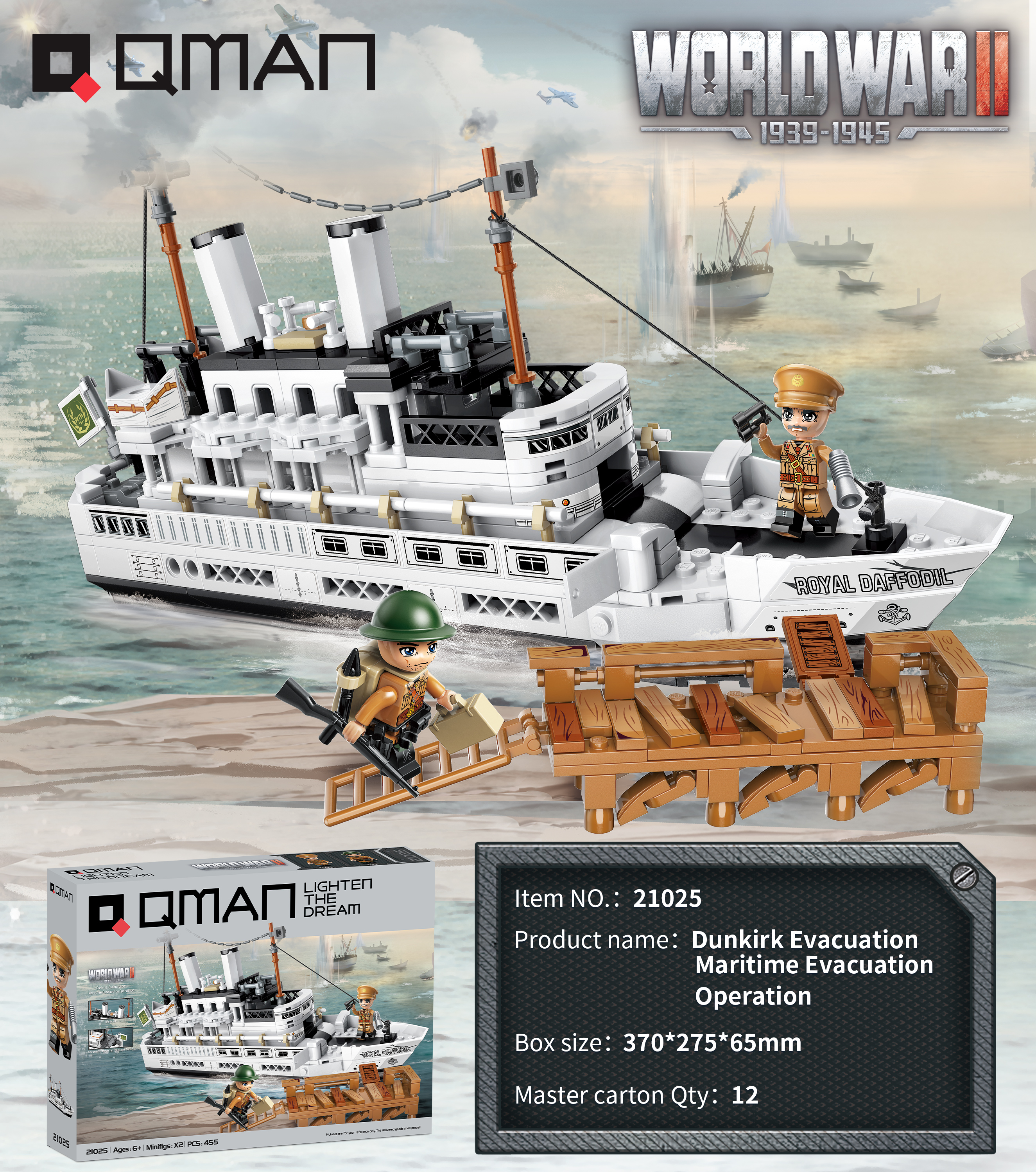 Đồ chơi xếp hình, lắp ráp Qman 21025 – Sơ tán hàng hảiGiới thiệuBộ xếp hình, lắp ráp Qman 21025 – Sơ tán hàng hải là sản phẩm mới chủ đề quân sự trong Thế Chiến II, bộ sưu tập rất hấp dẫn của QMAN....