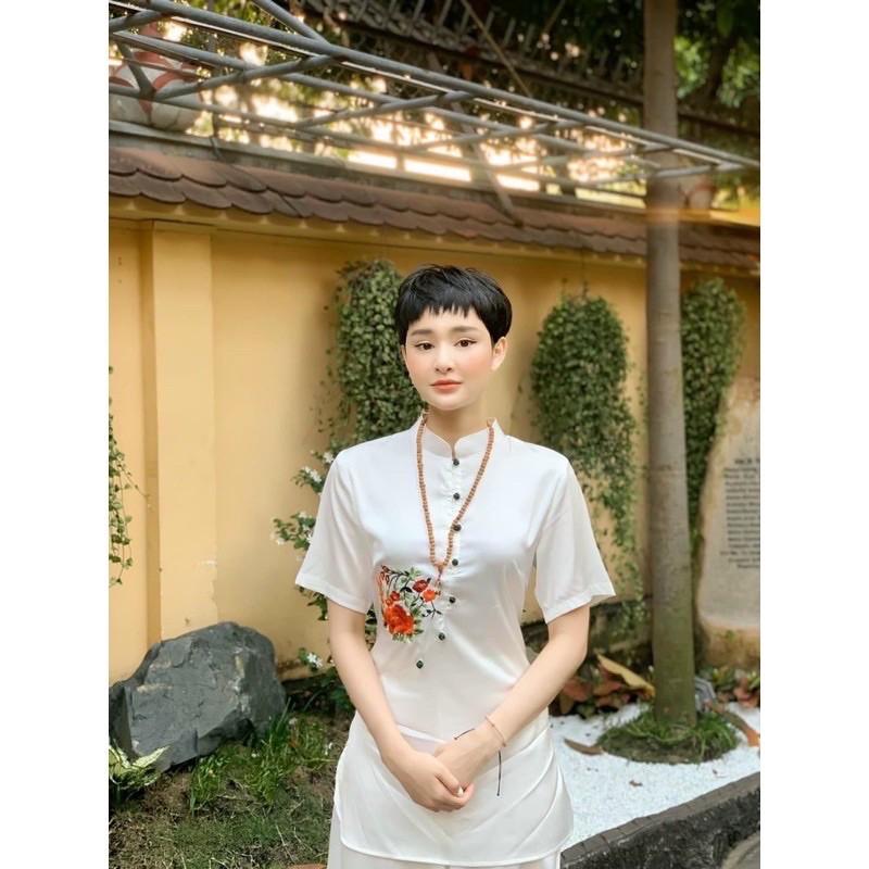 Quần áo đi chùa - Bộ thêu hoa 3D màu trắng - Tâm An Store