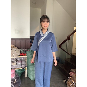 (Ảnh + Video shop tự quay) Bộ đồ lam đi chùa cổ tàu thêu sen gồm cả áo và quần, áo được thêu sen, quần có túi . Size: 24/26/28/30/32/34/36 ( tham khảo bảng chọn